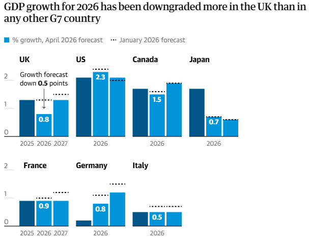 在主要发达经济体中,英国所遭受的打击尤为剧烈。IMF将英国2026年经济增长预期从此前的1.3%大幅下调至0.8%,下调幅度在七国集团(G7)中居首。与此同时,英国通胀前景也显著恶化,预计2026年全年平均通胀率将高达3.2%,在G7中继续领跑,且要到2027年底才有望回落至2%的目标水平。